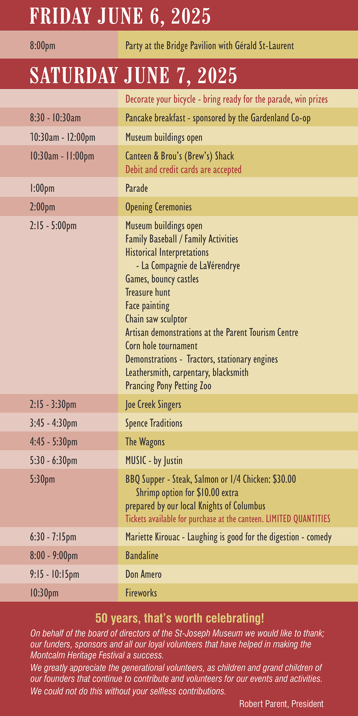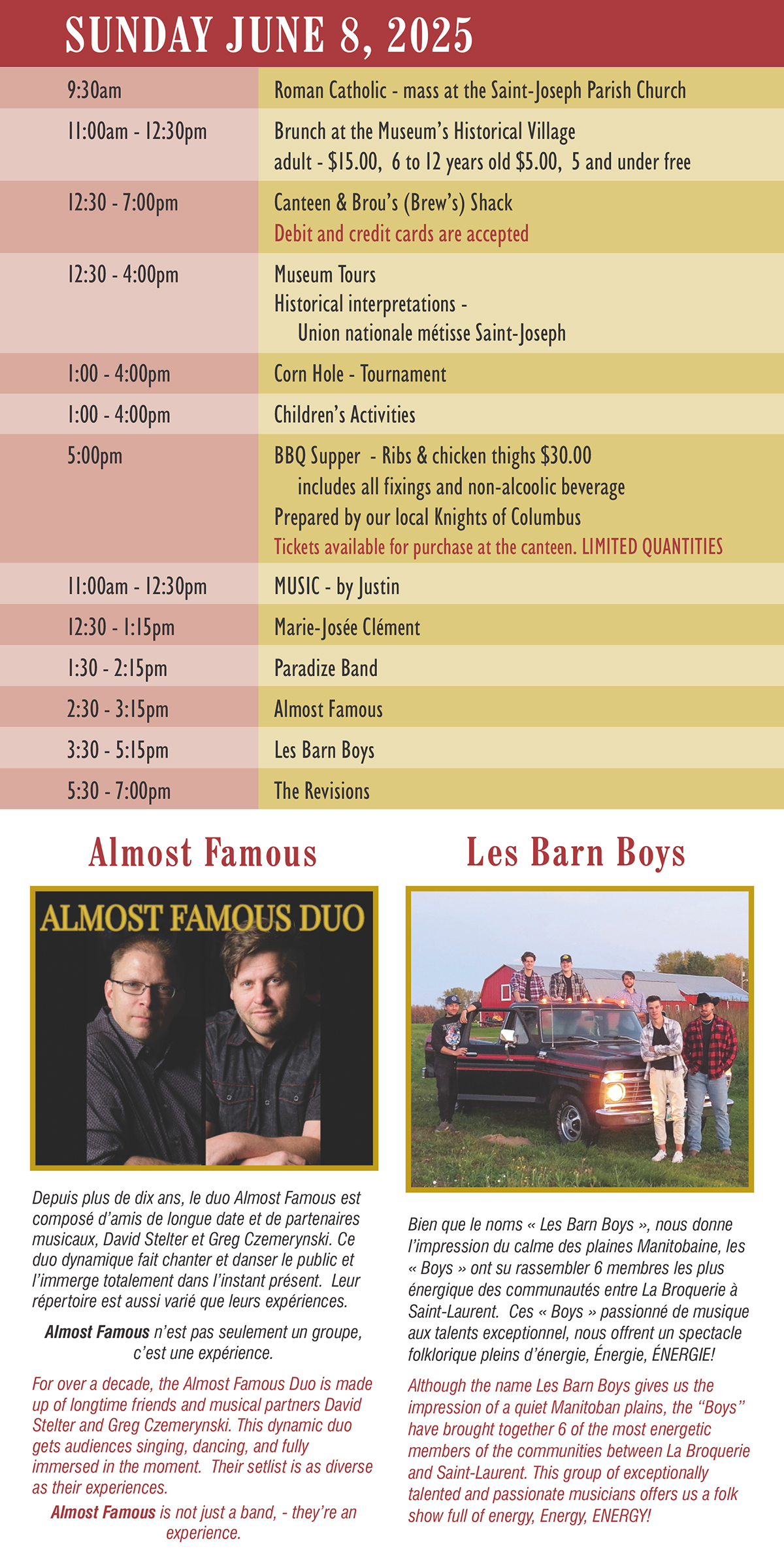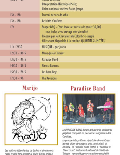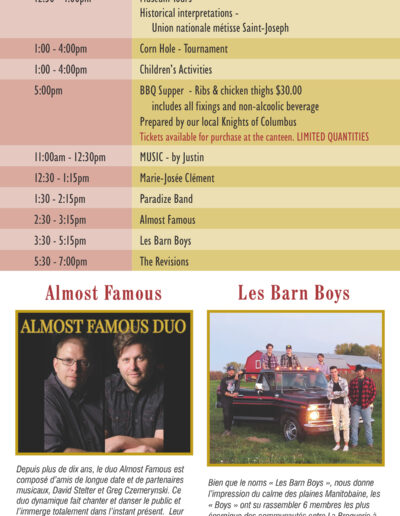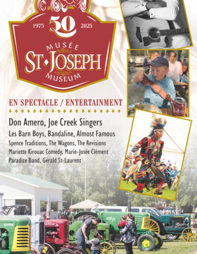 Le Musée Saint-Joseph et la grande équipe de bénévoles sont fières de vous inviter à venir célébrer notre culture et notre Joie de vivre au Festival du patrimoine Montcalm. Venez jouir d’une grande variété d’activités, de spectacles et d’interprètes historique. Visitez les édifices, d’exposition d’agriculture, d’engins à vapeur et l’agriculture des betteraves à sucre du Manitoba.